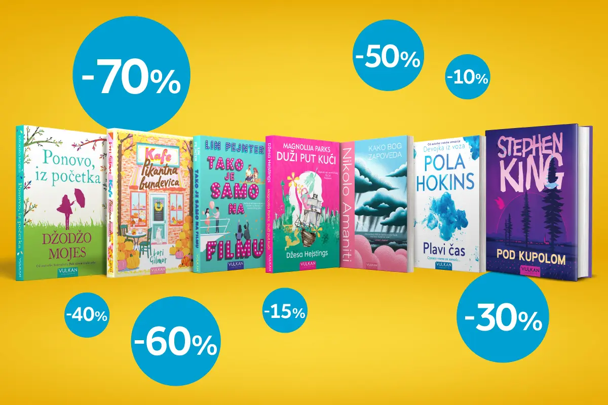 Ukoliko se u vašem izboru nađu neki od 30 najčitanijih naslova Vulkan izdavaštva, možete ih nabaviti uz popust od 30%, a uz sve to, pojedine naslove iz ogromne ponude moći ćete da nabavite i po ceni sniženoj za 70%!