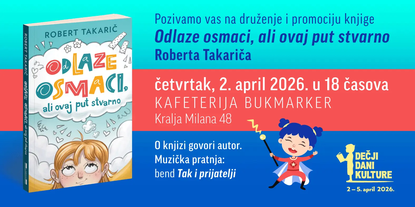 U knjižari Delfi SKC, u četvrtak 2. aprila od 18 sati družimo se sa hit piscem Robertom Takaričem, koji će predstaviti svoju novu knjigu „Odlaze osmaci, ali ovaj put stvarno“.