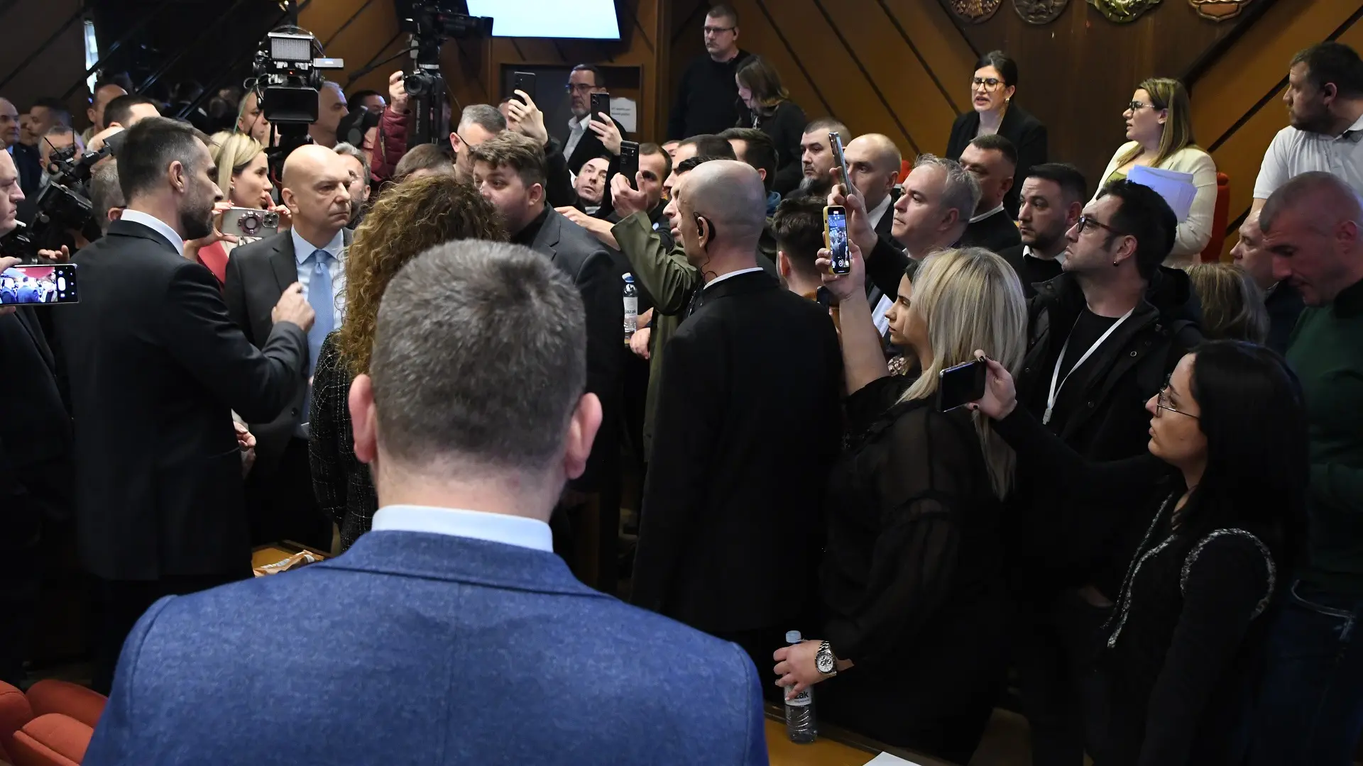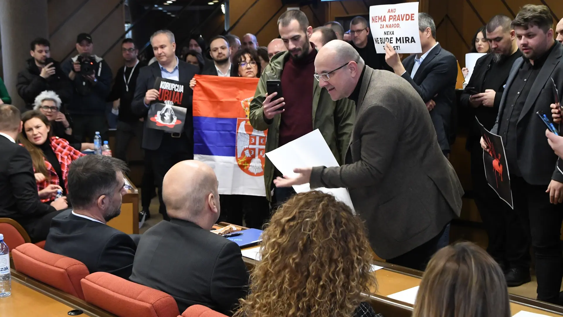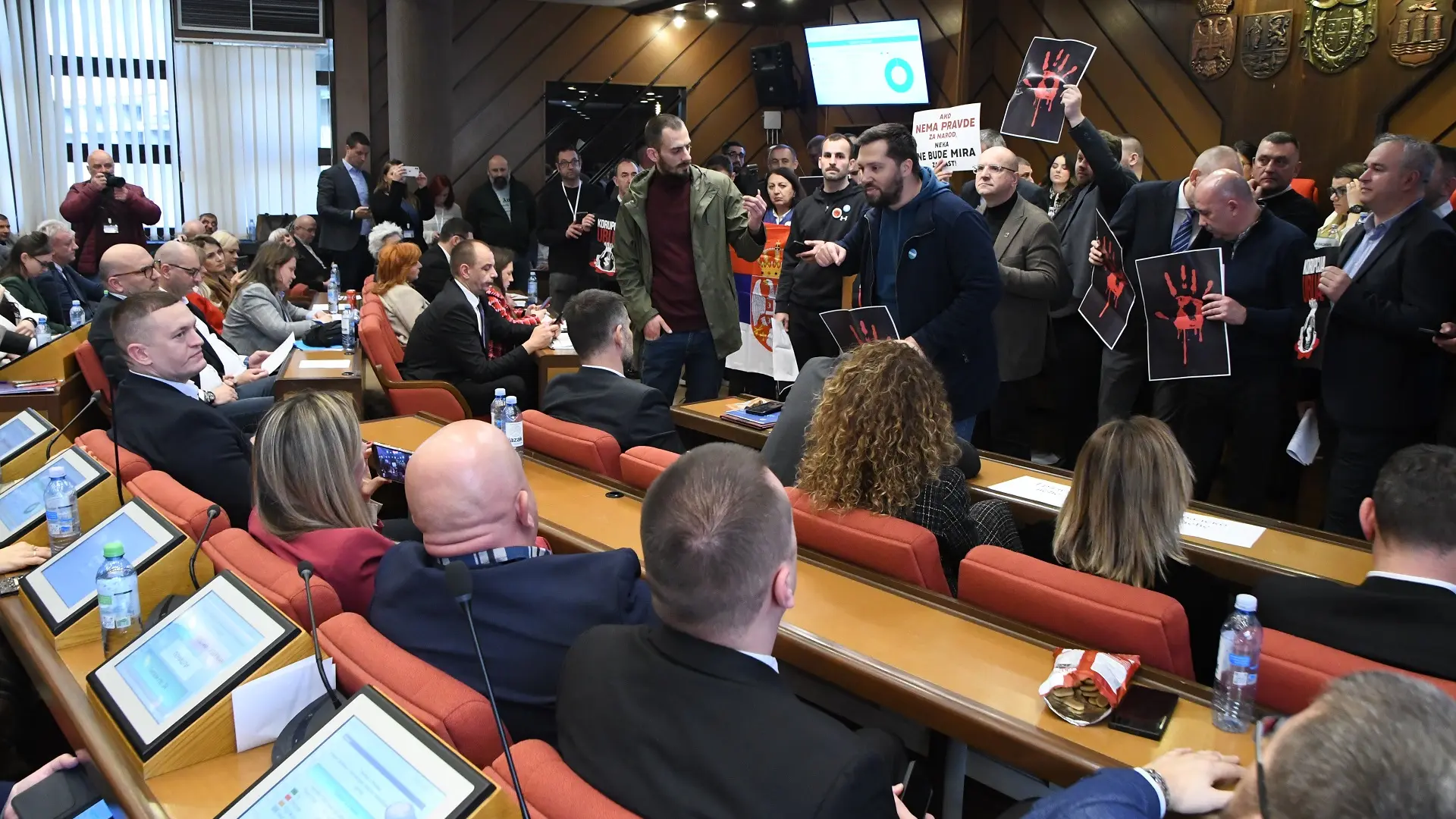 Odbornici opozicije sve vreme su ometali rad tako što su ustali sa svojih mesta i stali oko stola predsedavajuće, držeći transparente na kojima je iscrtana crvena ruka i galameći.