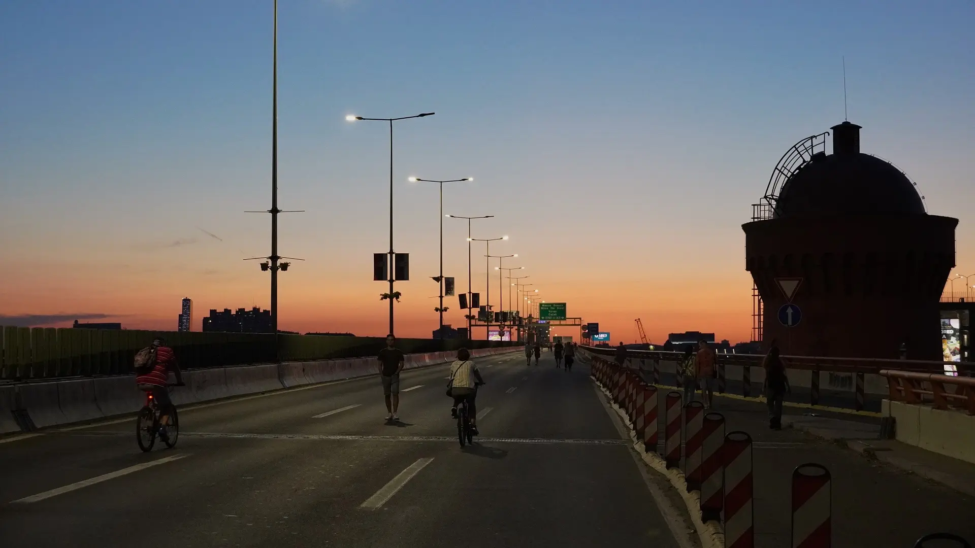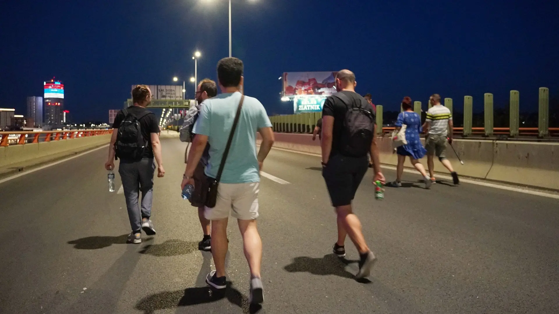 Policija obezbeđuje ulaz na most Gazela, gde nema mnogo ljudi, dok je većina koncentrisana na samom auto-putu. Nose zastave sa natpisima ''Konjarnik uz studente'' , ''Zemunski zbor'', ''Batajnica'', ''Obrenovac''...