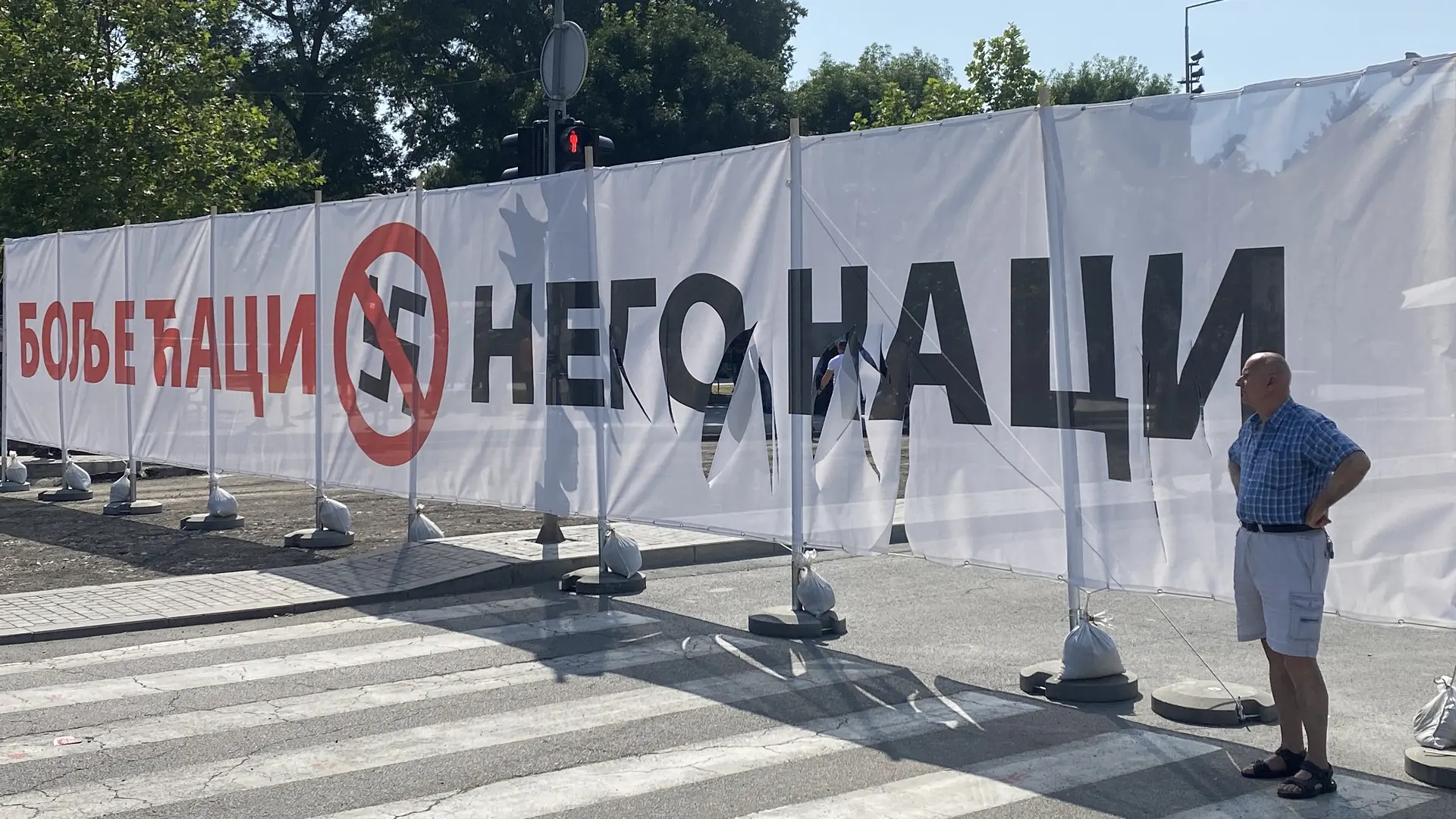 Policija je grupu koja je pokušala da skloni transparent upozorila da se pomeri što su oni i učinili, javlja reporter Tanjuga.