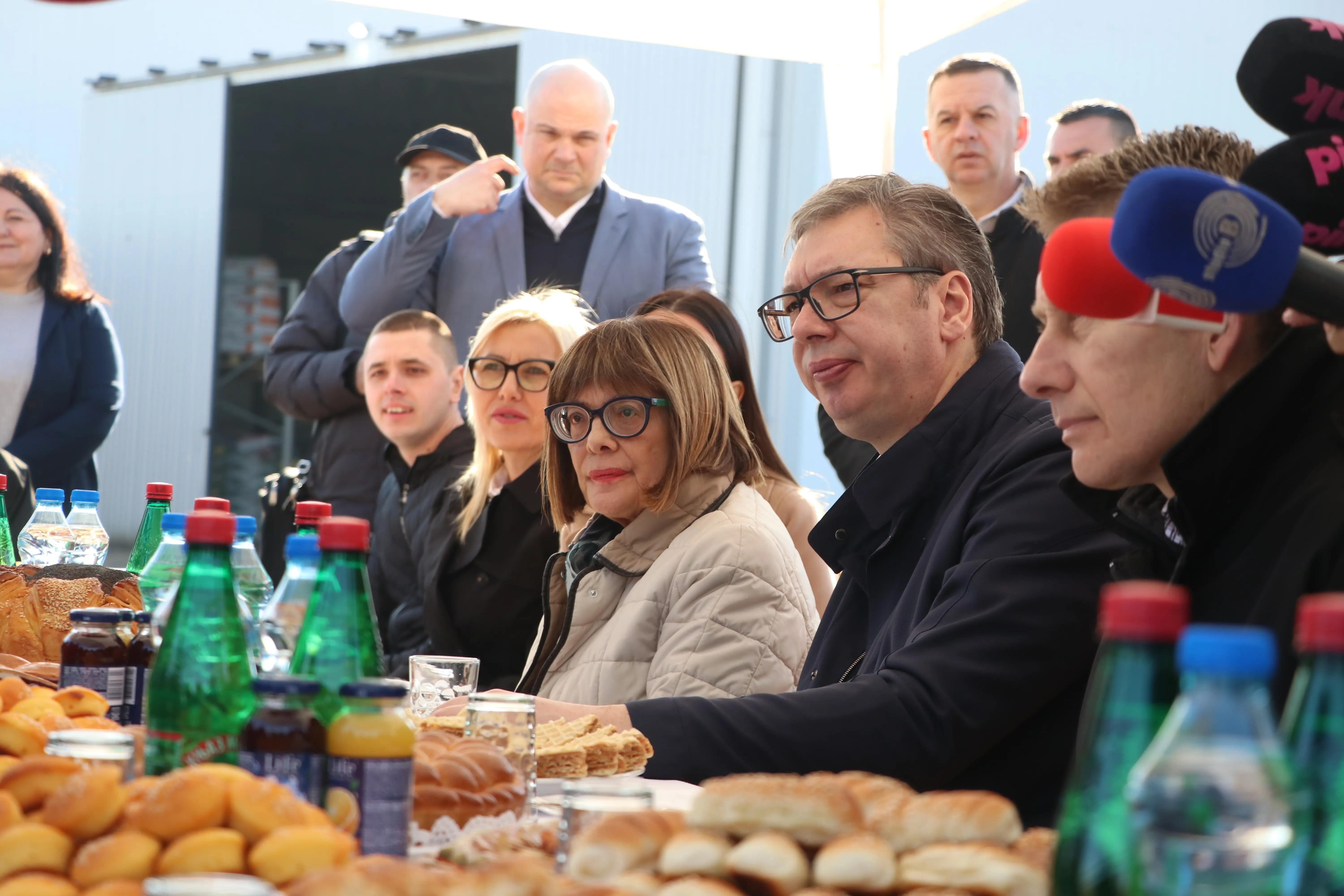 Vučića su dočekali vlasnik gazdinstva Miloš Kreculj i meštani, a prisustvuju i ministar poljoprivrede Aleksandar Martinović, ministarka privrede Adrijana Mesarović, kao i predsednica Pokrajinske vlade Maja Gojković.