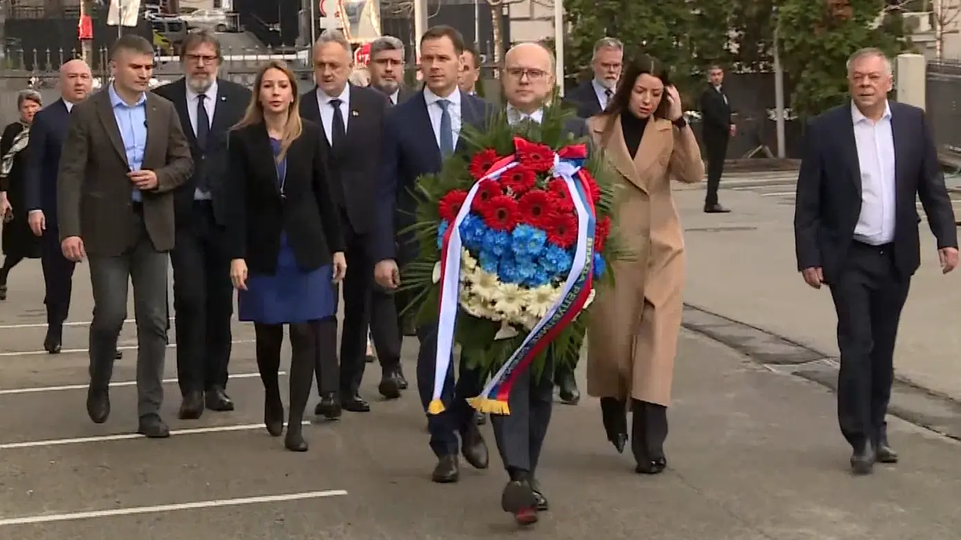 Foto: TANJUG/VLADIMIR ŠPORČIĆPremijer Miloš Vučević i članovi vlade položili su danas vence na mestu na kom je izvršen atentat na nekadašnjeg predsednika Vlade Srbije Zorana Đinđića pre 22 godine.