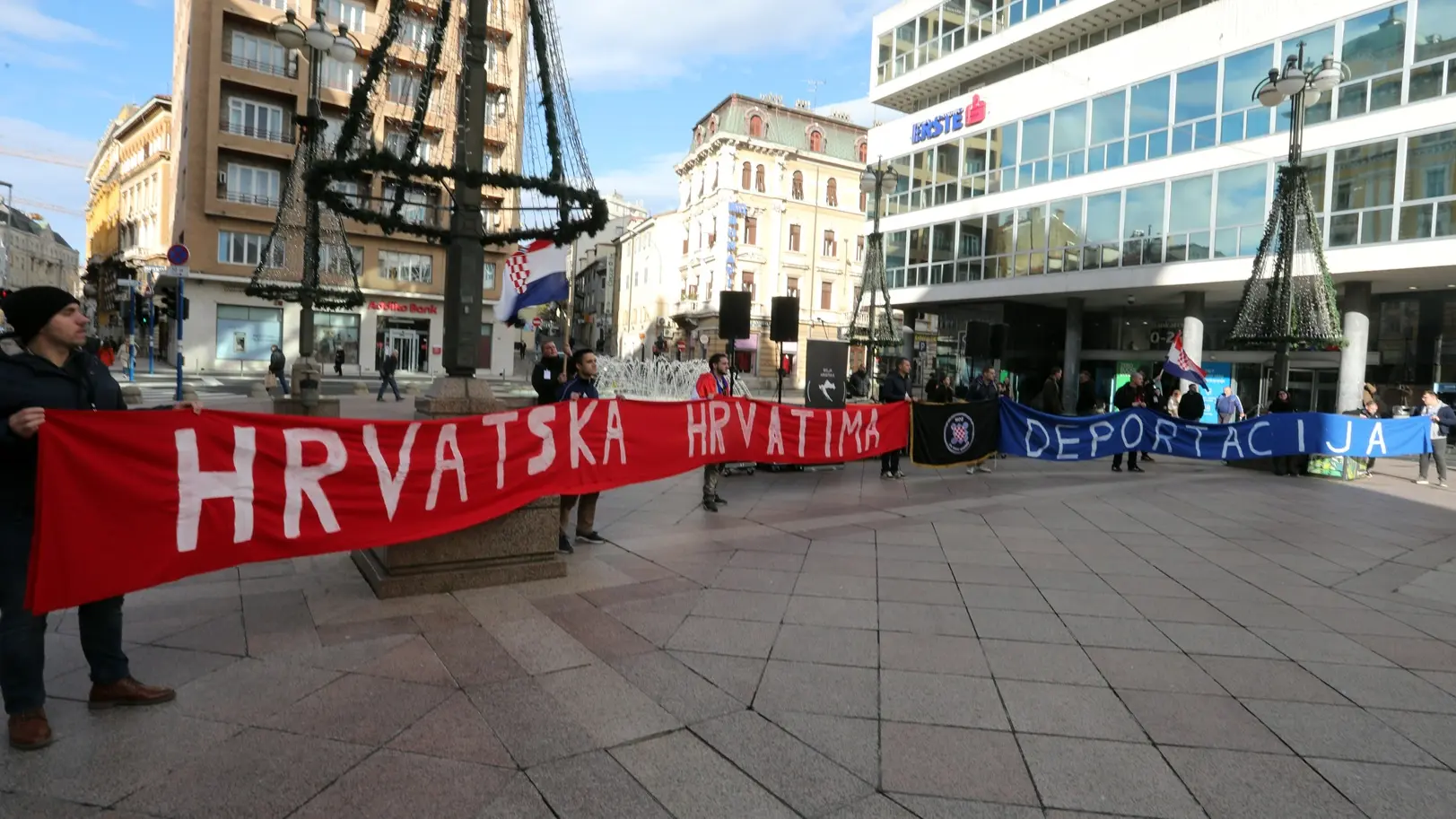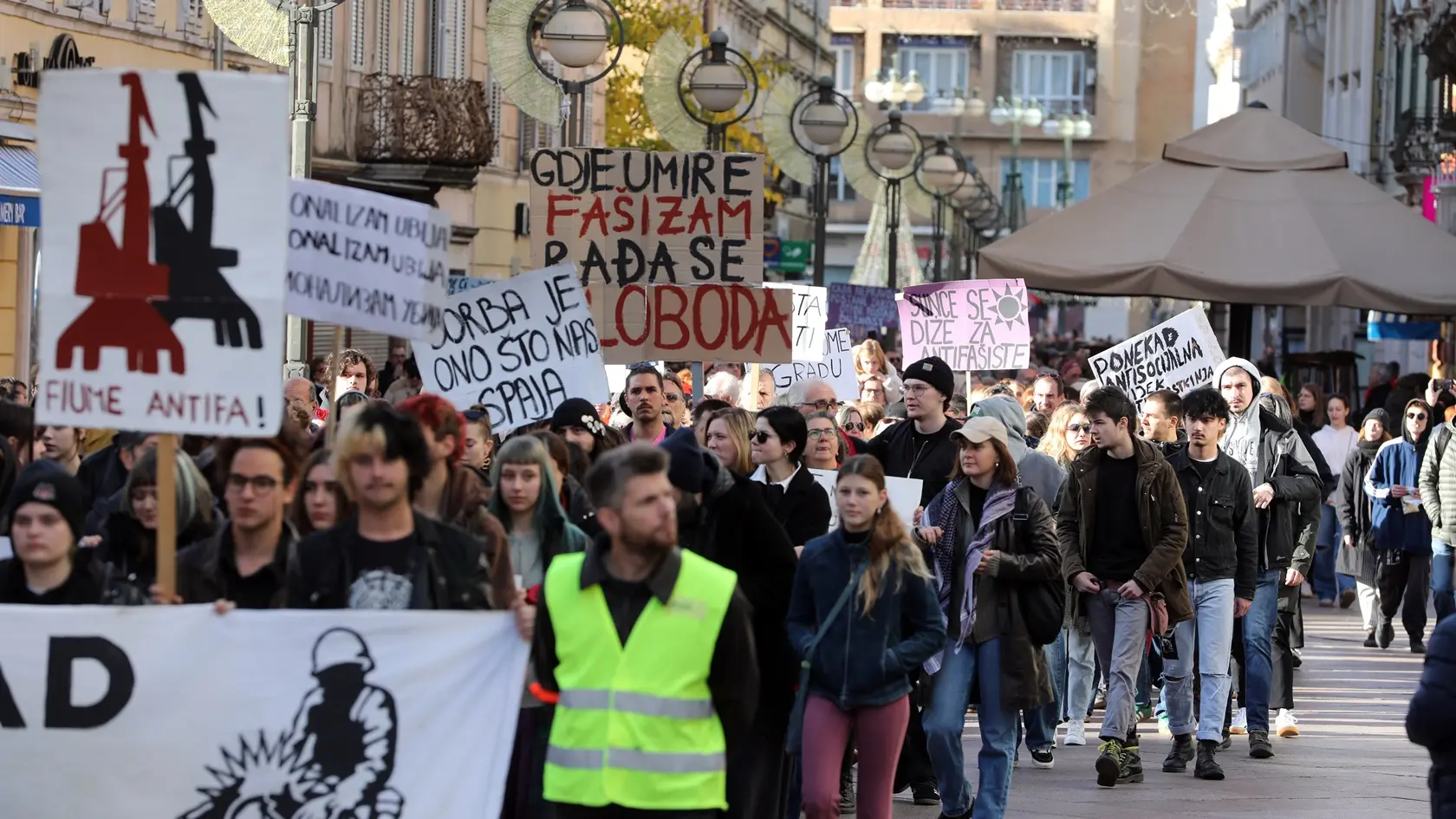 Foto: Zeljko Lukunic/PIXSELLRiječka policija pustila je na slobodu devetoricu privedenih nakon što je protiv njih podnela otužne predloge, zbog toga što su tokom održavanja protesta "Ujedinjeni protiv fašizma", u nedelju u Rijeci, maskirani uzvikivali ustaški poklič "Za dom spremni", dizali desnice i nasrtali na učesnike ovog javnog skupa.