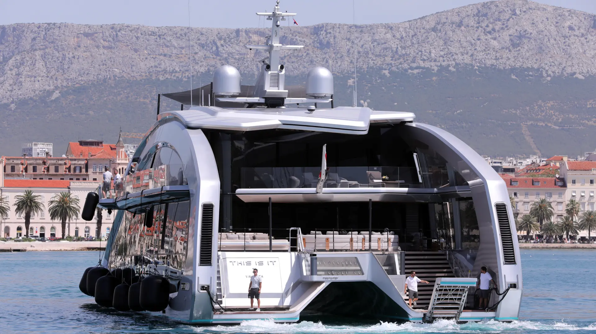 Foto: Ivo Cagalj/PIXSELLJahta "This Is It", namenjena za iznajmljivanje, stigla je u splitsku luku, ističući se svojim neobičnim izgledom.