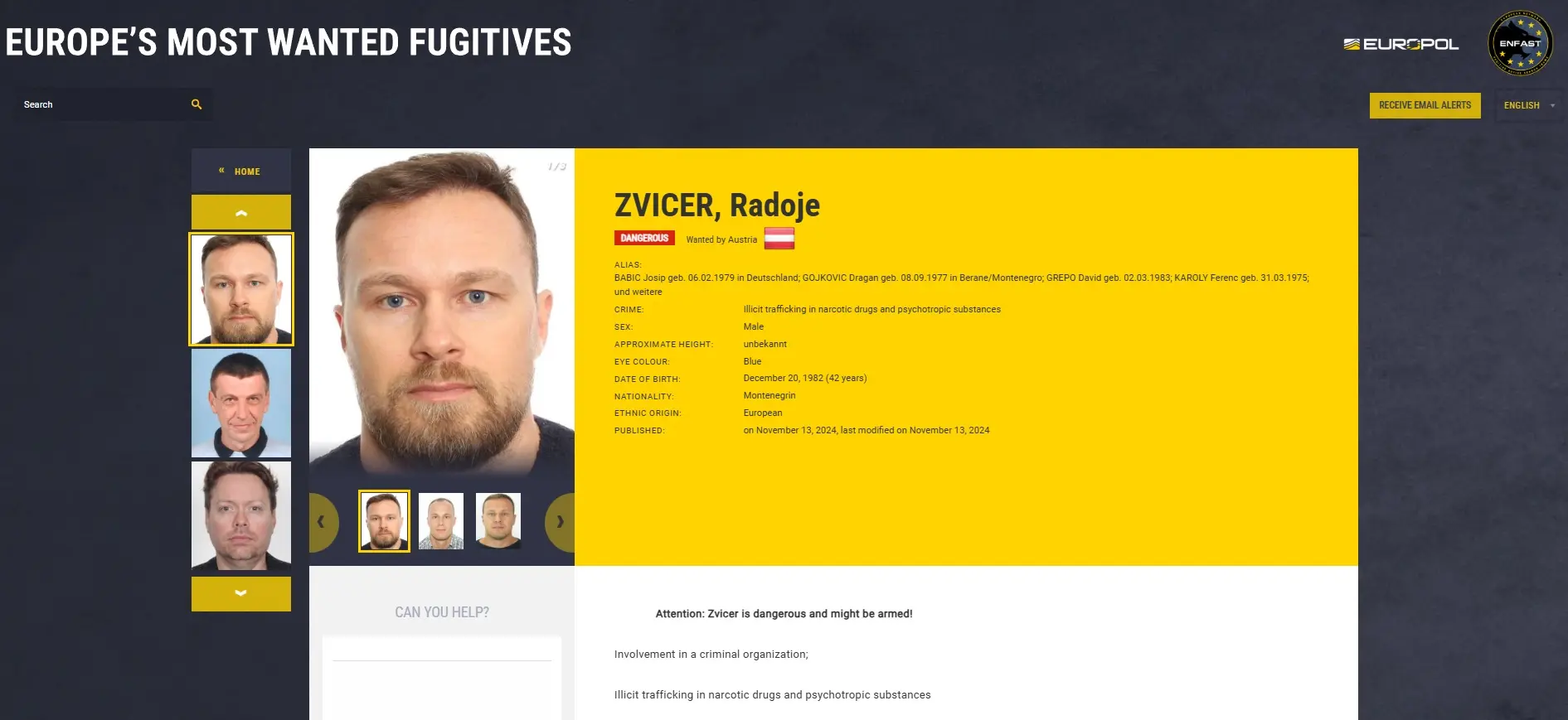 Foto: Printscreen/eumostwanted.euNa zahtev Austrije, Generalni sekretarijat Interpola u Lionu objavio je javnu međunarodnu poternicu za Radojem Zvicerom (42), crnogorskim državljaninom i optuženim vođom "kavačkog klana", povodom optužbi za trgovinu drogom. Poternica raspisana za zahtev Austrije vidljiva je na sajtu Interpola. Austrija je ranije objavila i nacionalnu poternicu za Zvicerom.