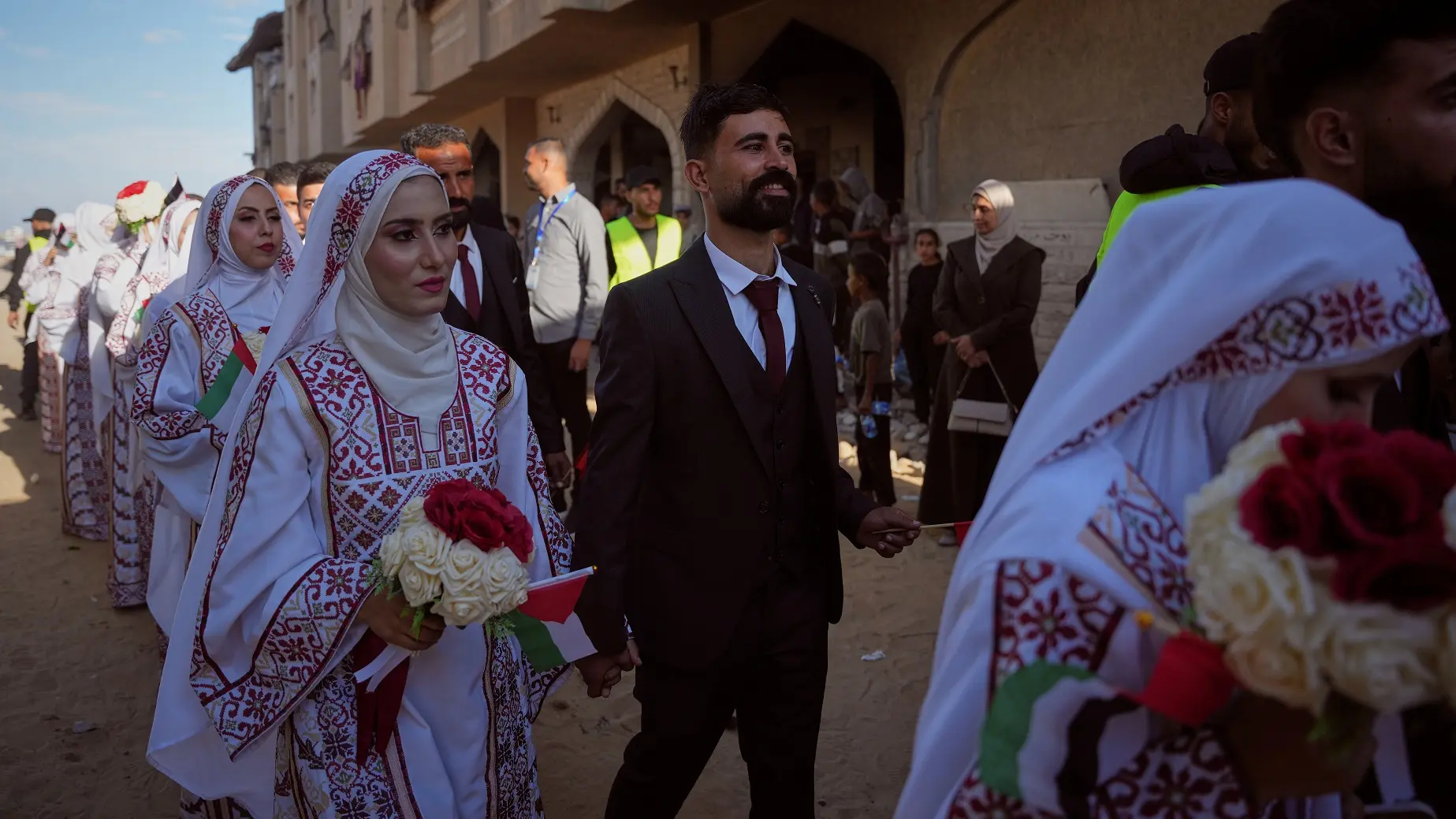 Povorka venčanih parova prošla je kroz razrušene delove grada uz palestinske zastave i muziku.