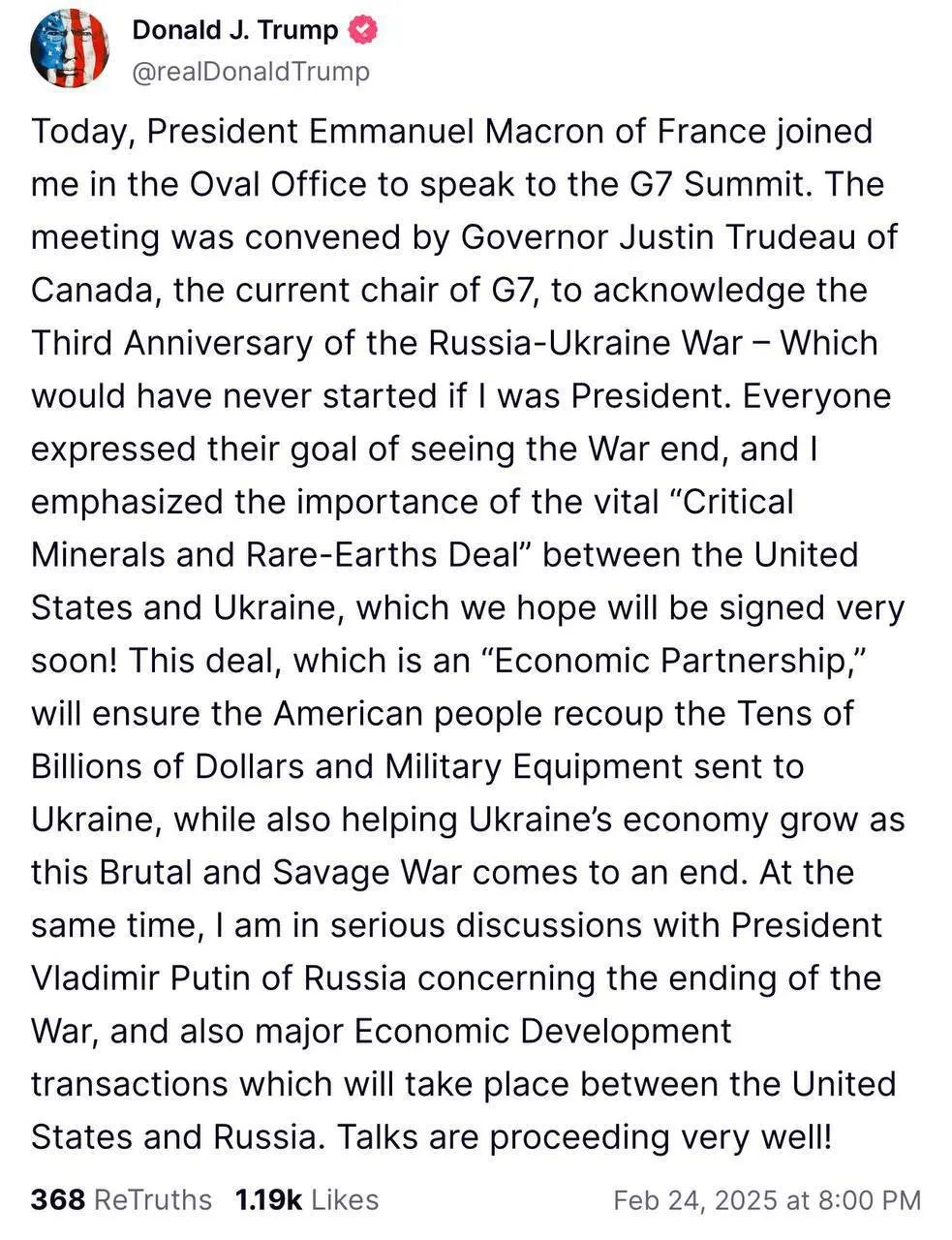 Tramp je na svojoj društvenoj mreži Truth Social napisao da je "u ozbiljnim razgovorima" sa Putinom i o velikim bilateralnim ekonomskim projektima koji će uslediti između Sjedinjenih Američkih Država i Rusije.