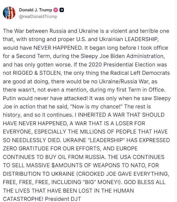 "Rat Rusije i Ukrajine je nasilan i užasan. Sa adekvatnim vođstvom u Americi i Ukrajini, nikada se ne bi desio. Počeo je dugo pre nego što sam se vratio u Belu kuću, tokom administracije "Uspavanog Džoa Bajdena", naveo je Tramp.