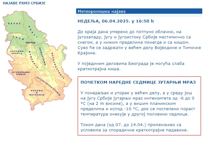 U ponedeljak i utorak u većem delu, a u sredu još na jugu Srbije očekuje se jutarnji mraz intenziteta od -6 do 0 °S (na 2 m visine), a u višim planinskim predelima i ispod -10 °stepeni.