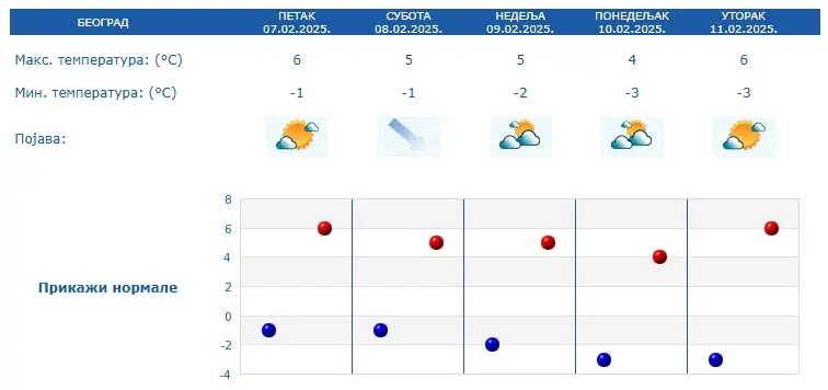 Najniža temperatura od -8 stepeni do -1 a najviša od 4 do 9.