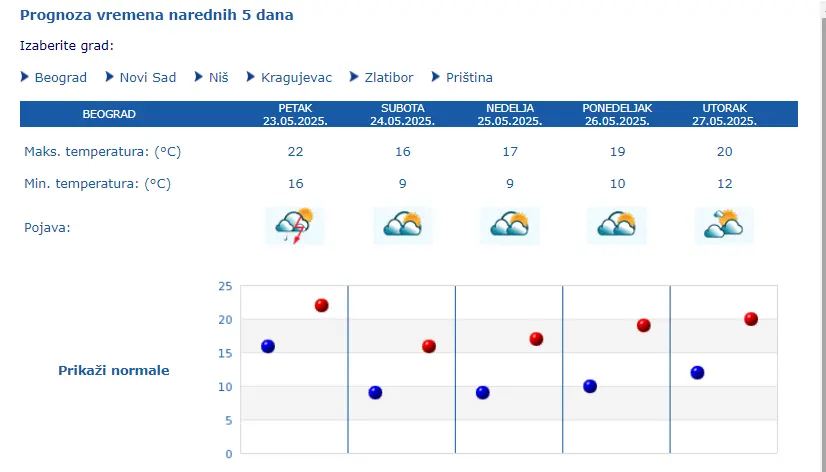 Dodao je da će do kraja maja vreme biti kišovito i oblačno praćeno grmljavinom, kao i da očekuje pojavu sunca.