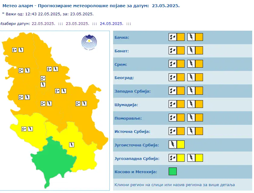 Ristić je za Tanjug rekao da se očekuju kratkotrajno jaki pljuskovi, grada i jaka kiša, ali i dosta munja i gromova.