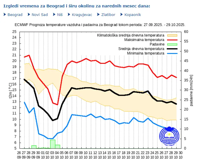 Prema prognozi, u četvrtak i petak očekuje se oblačno vreme sa kišom i hladno, osim na severozapadu Vojvodine gde će se zadržati suvo vreme.