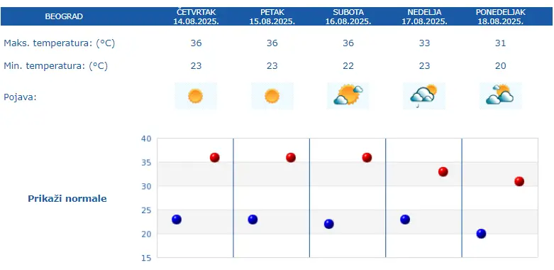 U četvrtak 21. avgusta očekuje nas poslednji udar toplotnog talasa kada će temperature ponovo biti preko 35 stepeni u toku dana, ali neće se zadržati u danima koji slede.