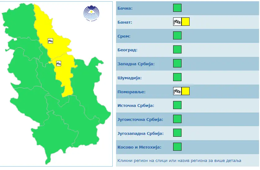 Kako se vidi na mapi RHMZ, na snazi je danas žuti meteoalarm u Banatu i Pomoravlju zbog vetra olujne jačine.