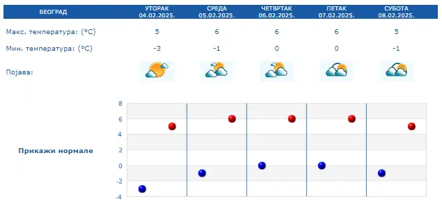 U utorak ujutro u svim krajevima Srbije slab do umeren mraz, a mestimično se očekuju magla ili niska oblačnost, naročito na istoku, jugoistoku i jugozapadu zemlje. U ovim oblastima magla i niska oblačnost zadržaće se i pre podne. U ostalim krajevima pretežno sunčano. Vetar slab, promenljiv. Najniža temperatura od -7 do 0 °C, a najviša od 4 do 9 °C, ističu iz RHMZ-a.
