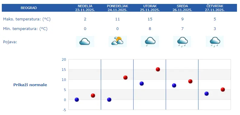 „Sredinom nedelje uz premeštanje hladnog fronta zahlađenje uz kišu i planinski sneg, vetar u okretanju na severozapadni, a maksimumi u sledeći četvrtak verovatno do +3 do +9 stepeni Celzijusa, na planinama hladnije. Još jedno pogoršanje je moguće oko 30.11, ali za sada nema najava za dolazak prave, održive, hladnoće, barem ne do 7.12.“