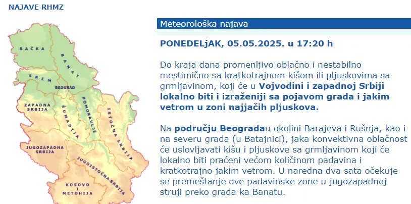 Republički hidrometeorološki zavod najavio je nestabilno vreme praćeno pljuskovima i grmljavinom, a u nekim delovima Srbije nevreme će biti intenzivnije.