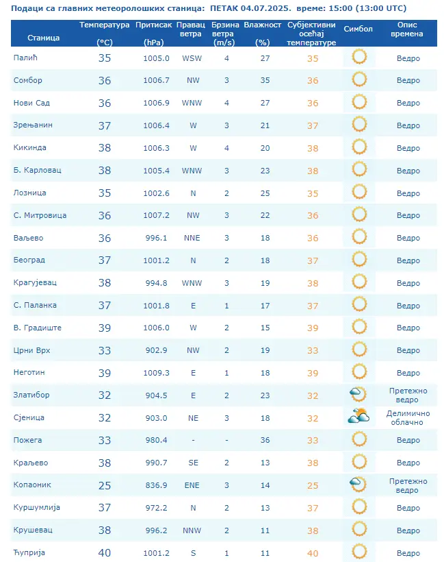 Prema podacima dobijenim sa glavnih meteoroloških stanica RHMZ-a najveća temperatura izmerena je danas u Ćupriji sa 40 stepeni Celzijusovih.