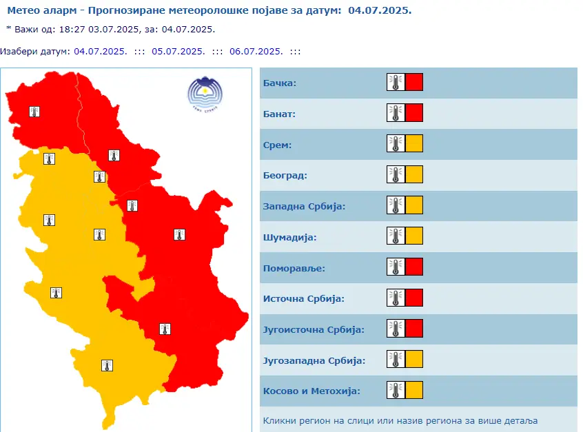 RHMZ je ranije upozorio da se do 8. jula na području Srbije očekuje intenziviranje toplotnog talasa sa maksimalnim temperaturama u većini mesta od 34 do 38 stepeni, a danas, u nedelju i početkom naredne sedmice (od 6. do 8. jula) lokalno i oko 40 stepeni.