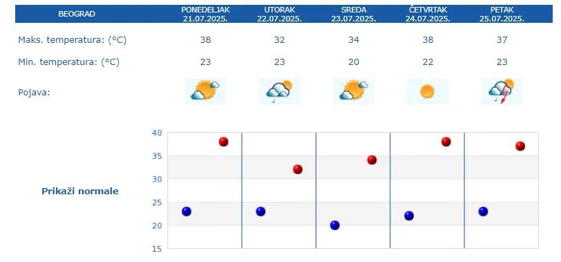 U ostalim danima u toku perioda prognozira se od 32 do 35 stepeni.