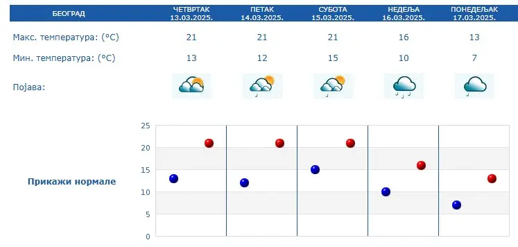 Dok maksimalna temperatura na severu i zapadu zemlje neće prelaziti 20 stepeni, u ostatku zemlje biće i do 25 stepeni, a na jugoistoku Srbije i do čak letnjih 27 stepeni. Niš, Leskovac, Pirot i Dimitrovgrad biće najtopliji gradovi.
