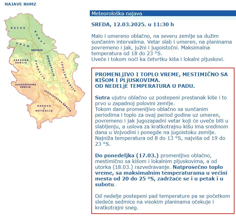 Padavine će se u jugozapadnoj visinskoj struji premeštati ka severoistoku i već u četvrtak tokom jutra će prestati i to prvo na zapadu i jugozapadu zemlje i nastaviti put dalje ka Mađarskoj i Rumuniji, pa će i u četvrtak tokom dana biti suvo i sunčano.