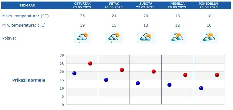Tokom dana biće promenljivo oblačno, u petak mestimično sa kratkotrajnim padavinama koje se za vikend i početkom sledeće sedmice očekuju uglavnom u jugoistočnim, južnim i jugozapadnim predelima naše zemlje.