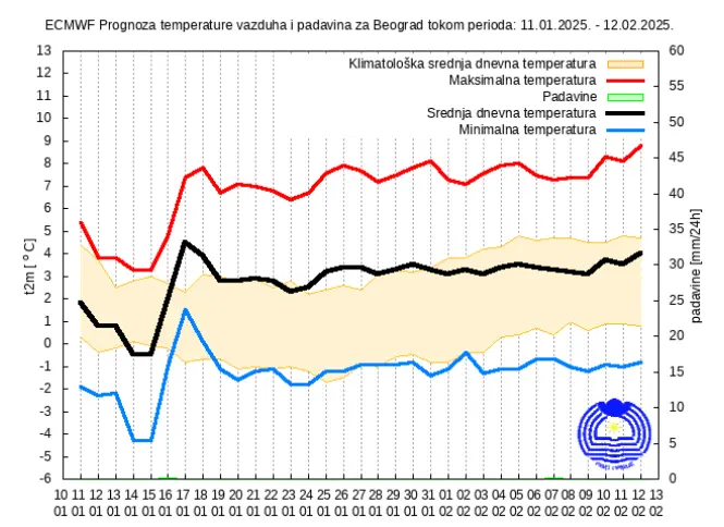 Slab sneg očekuje se još ponegde u utorak (14.01.) na jugu Srbije, a zatim će do kraja druge dekade januara biti suvo sa jutarnjim temperaturama od -8 do -1 °C dok će maksimalne vrednosti do četvrtka (16.01.), uz umerenu oblačnost, biti od -1 do 3 °C, u Negotinskoj Krajini do 5 °C, a potom u porastu.