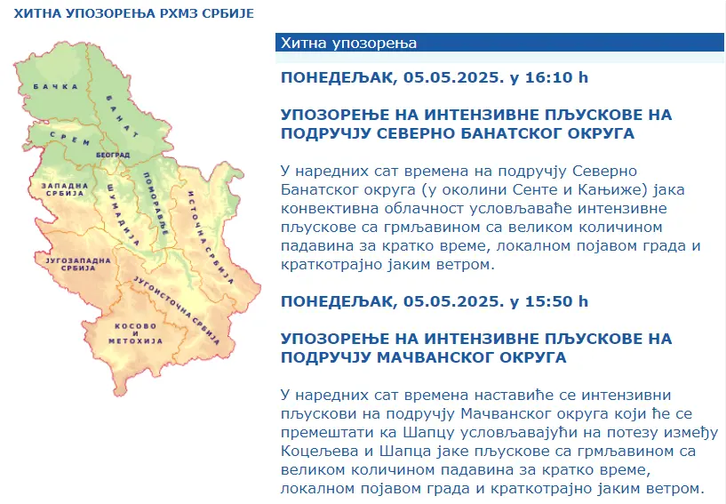 RHMZ je upozorio da će na području Severnobanatskog okruga, u okolini Sente i Kanjiže, jaka konvektivna oblačnost uslovljaviti intenzivne pljuskove sa grmljavinom, sa velikom količinom padavina za kratko vreme, lokalnom pojavom grada i kratkotrajno jakim vetrom.