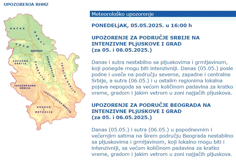 Danas uveče na području severne, zapadne i centralne Srbije, a sutra i u ostalim regionima, očekuje se lokalna pojava nepogoda sa većom količinom padavina za kratko vreme, gradom i jakim vetrom u zoni najjačih pljuskova, navodi se u upozorenju.