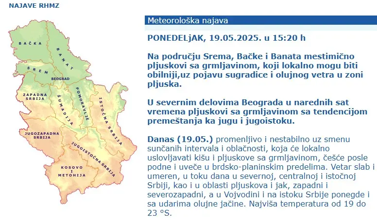 U Srbiji je za danas najavljeno promenljivo i nestabilno vreme uz smenu sunčanih intervala i oblačnosti, koja će lokalno uslovljavati kišu i pljuskove sa grmljavinom, češće posle podne i uveče u brdsko-planinskim predelima.