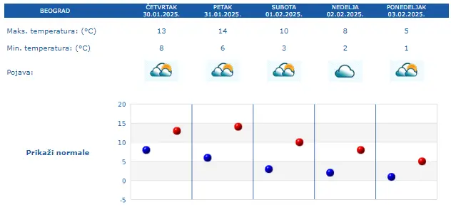 Od četvrtka umereno do potpuno oblačno uz postepeni pad temperature. U većini mesta biće suvo, a kiša se u četvrtak očekuje kao ređa pojava uglavnom u prvom delu dana, a u nedelju i ponedeljak u predelima južnije od Save i Dunava, dok će u brdsko-planinskim predelima jugozapadne i južne Srbije padati sneg uz formiranje manjeg snežnog pokrivača.