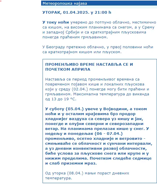 RHMZ najavljuje nastavak promenljivog vremena sa povremenom pojavom kiše i lokalnih pljuskova i za sutra (02.04.) koji ponegde mogu biti praćeni i grmljavinom. Maksimalna temperatura do vikenda od 13 do 19 °S.