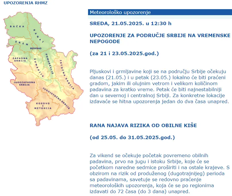 Kako napominju iz RHMZ-a, za konkretne lokacije izdavaće hitna upozorenja jedan do dva časa unapred.