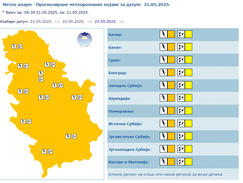 Sutra će žuti meteoalarm upozoravati na nepogode samo u Banatu, Bačkoj, kao i istočnoj i jugoistočnoj Srbiji, dok će u petak i žuto i narandžasto upozorenje biti na snazi u celoj zemlji.
