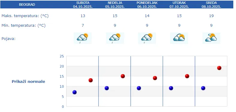 “Prosečna temperatura u Beogradu u ovom periodu godine je oko 20 stepeni. Danas je šest stepeni i sumnjam da će preći osam. Ako pogledamo istorijske podatke na današnji dan, najniža maksimalna temperatura izmerena je 1936. godine i iznosila je 8,6 stepeni. Realno je da će sa današnjih šest stepeni ovo biti najhladniji dan. Kada posmatramo dugi niz podataka, karakteristika oktobra je takva da imamo temperature i od 20 do 25 stepeni. Ako izračunamo prosečan datum sa maksimalnim temperaturama od 25 i više stepeni, to je 13. oktobar”, izjavio je on za K1 televiziju.