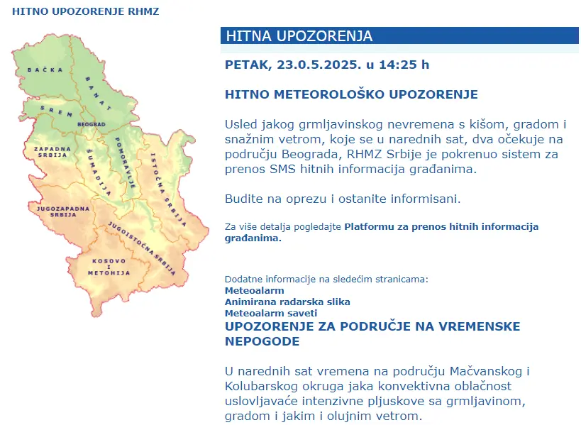 Plјuskovi i grmlјavine koji se na području Srbije očekuju danas, 23. maja, lokalno će biti praćeni gradom, jakim ili olujnim vetrom i velikom količinom padavina za kratko vreme i to posebno u Vojvodini i u centralnom pojasu Srbije, najavljeno je ranije. Za dobar deo Srbije danas je na snazi crveni meteoalarm.
