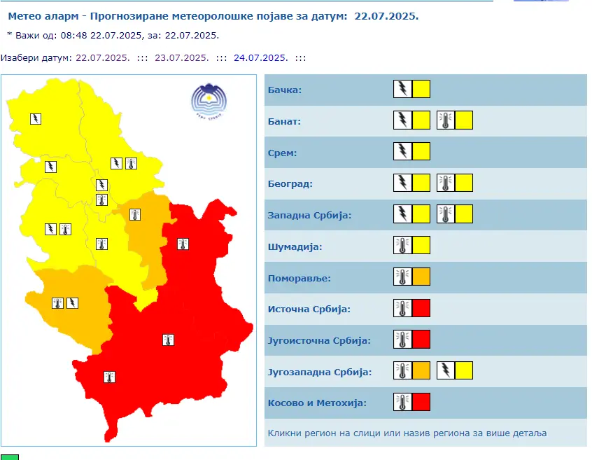 RHMZ podseća da je u nedelju pokrenuo sistem za prenos SMS hitnih informacija građanima, usled početka veoma jakog i dugotrajnog toplotnog talasa sa maksimalnim temperaturama od 37 do 40 stepeni, a u petak i subotu (25. i 26. jula) lokalno i do 42 stepena, koji će na području Pčinjskog, Jablaničkog, Topličkog, Nišavskog, Pirotskog i Zaječarskog okruga trajati najmanje pet dana u kontinuitetu.