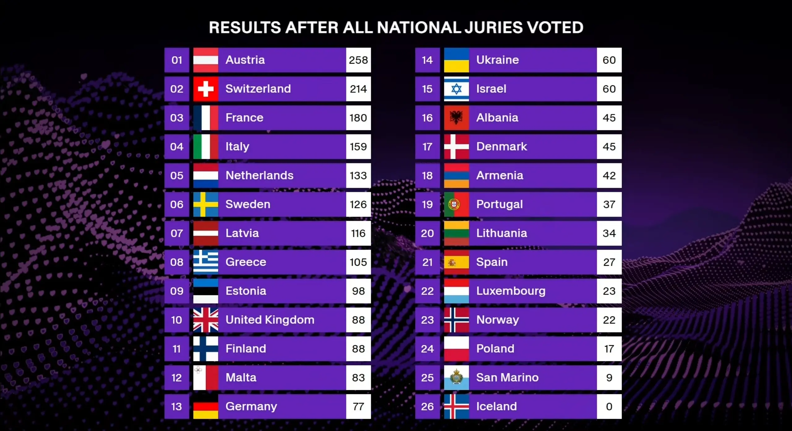 Nakon što su stručni žiriji svih zemalja glasali, na prvom mestu je ubedljivo Džej Džej, predstavnik Austrije.