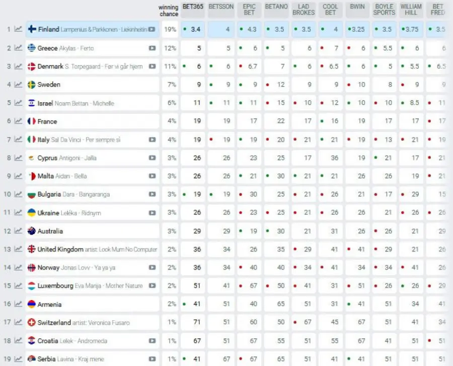 Među samim favoritima za pobedu na "Pesmi Evrovizije" - prema kladionicama na zvaničnom sajtu šoua - još uvek su Finska, Grčka i Danska.
