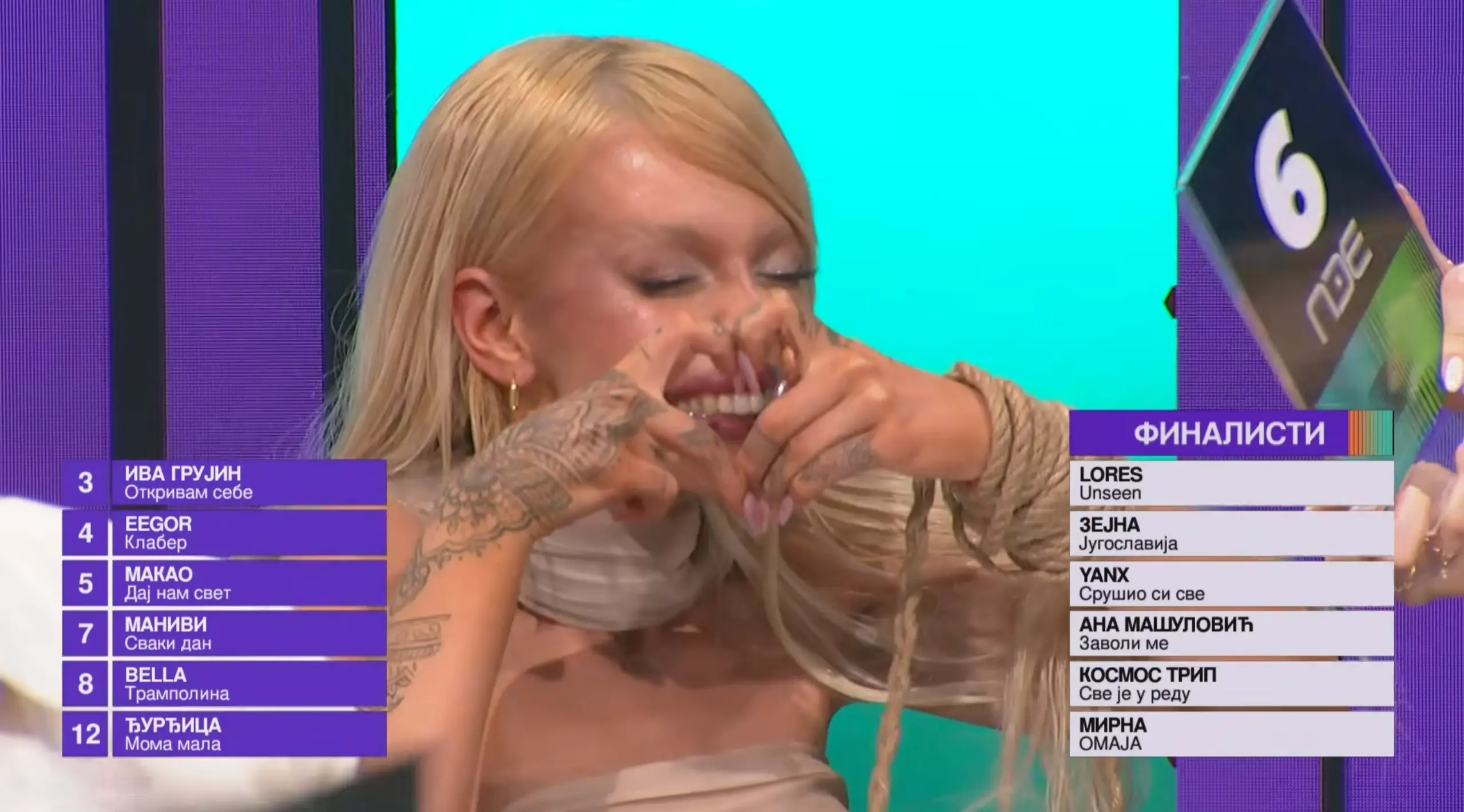 Foto: RTS PrintscreenVečeras, 24. februara, održano je prvo polufinale "Pesme za Evroviziju 2026" u kom se predstavilo dvanaest kompozicija, od kojih se samo sedam plasiralo u veliko finale u kom će Srbija izabrati predstavnika na Evroviziji u Beču.