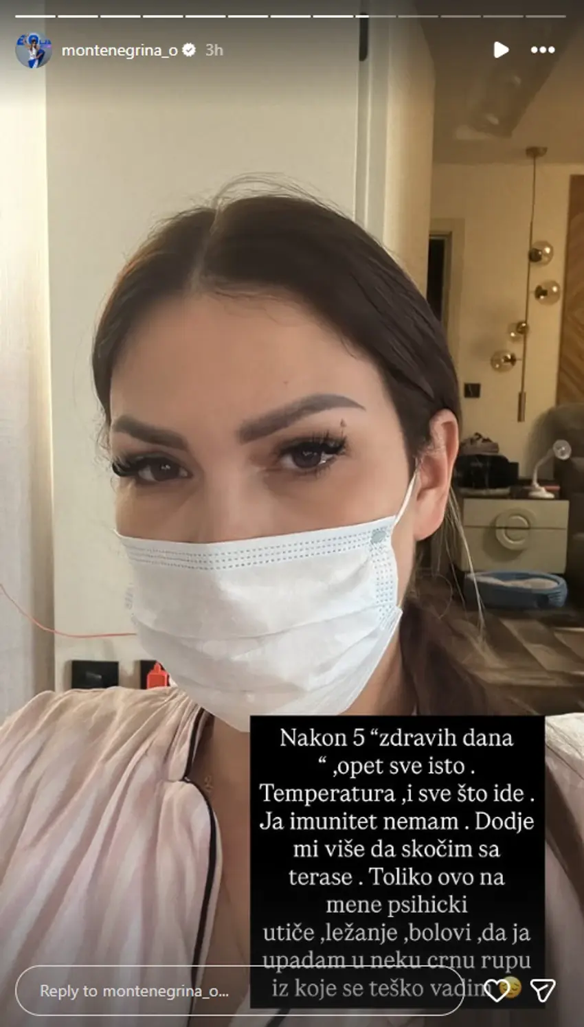 "Nakon 5 "zdravih dana", opet sve isto. Temperatura, i sve što ide. Ja imunitet nemam. Dođe mi više da skočim sa terase. Toliko ovo na mene psihički utiče, ležanje, bolovi, da ja upadam u neku crnu rupu iz koje se teško vadim", napisala je Olja Crnogorac.