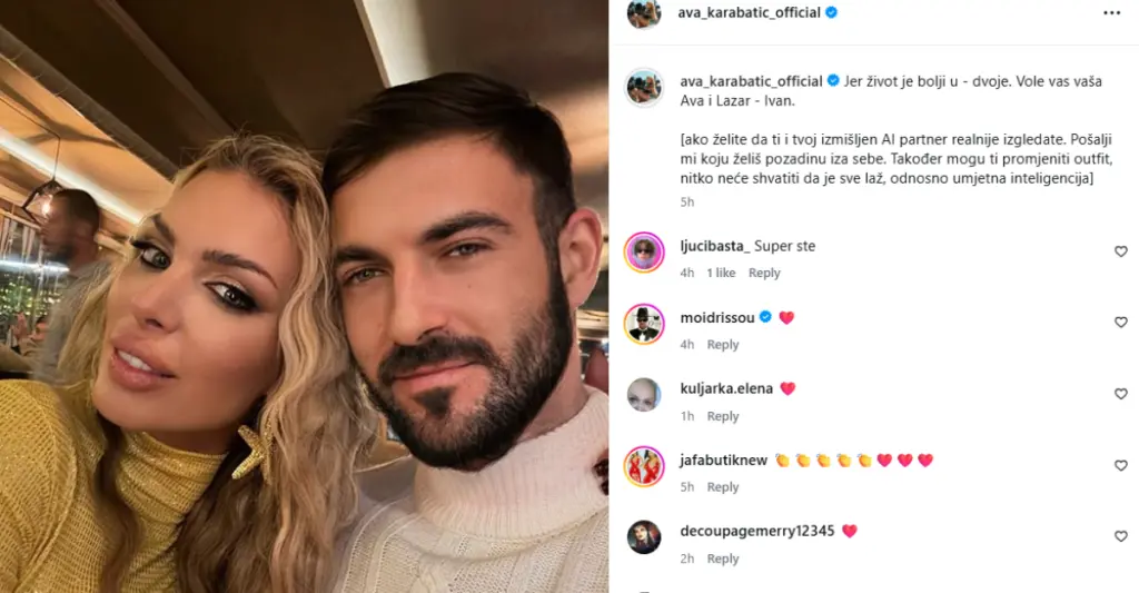 Inače, Ava je u prethodnim objavama predstavila svog dečka Lazara, tvrdeći da je njihova ljubavna priča počela još u fakultetskim danima u Zadru, te da ih je sudbina ponovo spojila nakon 18 godina.
