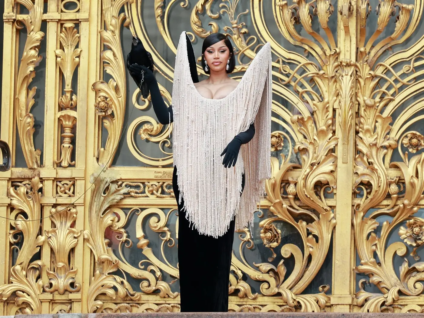 Kardi Bi je odabrala crnu strukiranu haljinu čiji je centralni motiv bio dekolte. Kako se vidi, visoke naramenice ukrašene biserima privukle su pažnju javnosti, jer su naglasile i njene bujne grudi.