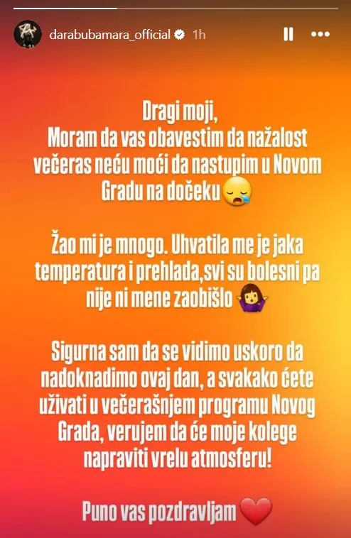 "Dragi moji, moram da vas obavestim da nažalost večeras neću moći da nastupim u Novom Sadu na dočeku. Žao mi je mnogo. Uhvatila me je jaka temperatura i prehlada, svi su bolesni pa ni mene nije zaobišlo. Sigurna sam da se vidimo uskoro da nadoknadimo ovaj dan", poručila je.