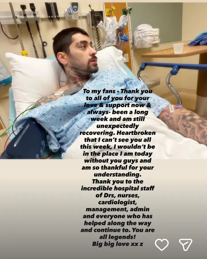 "Mojim fanovima. Hvala vam svima na ljubavi i podršci, danas i uvek. Bila je ovo neočekivano duga nedelja i još uvek se oporavljam. Srce mi se slama što ne mogu da vas vidim ove nedelje. Bez vas ne bih bio tu gde sam danas i veoma sam vam zahvalan na razumevanju", napisao je Malik pored svoje fotografije u bolničkom krevetu, prenosi list Parizijen.