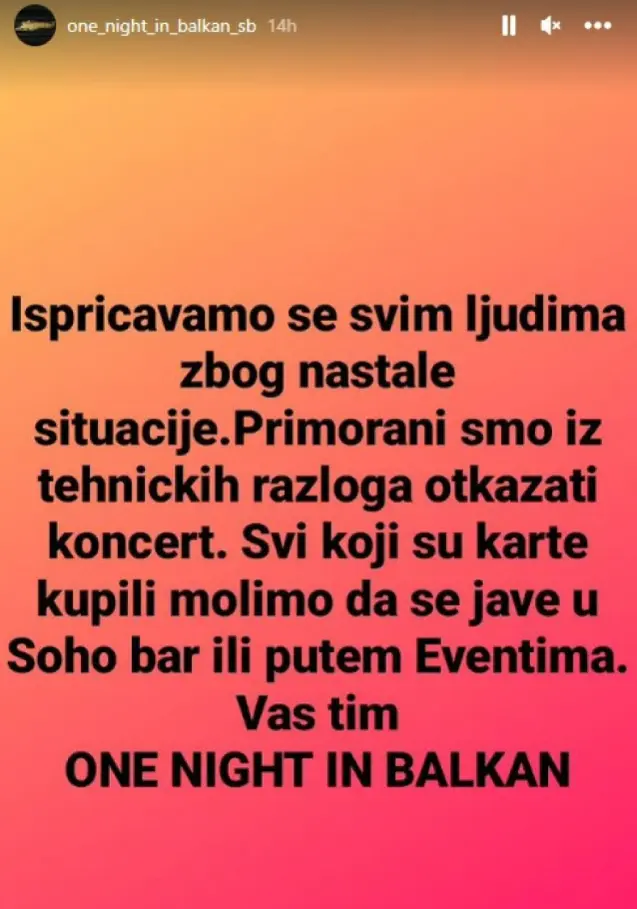 "Izvinjavamo se svim ljudima zbog nastale situacije. Primorani smo da iz tehničkih razloga otkažemo koncert. Svi koji su kupili karte molimo da se jave u Soho bar ili putem Eventima", napisali su organizatori.