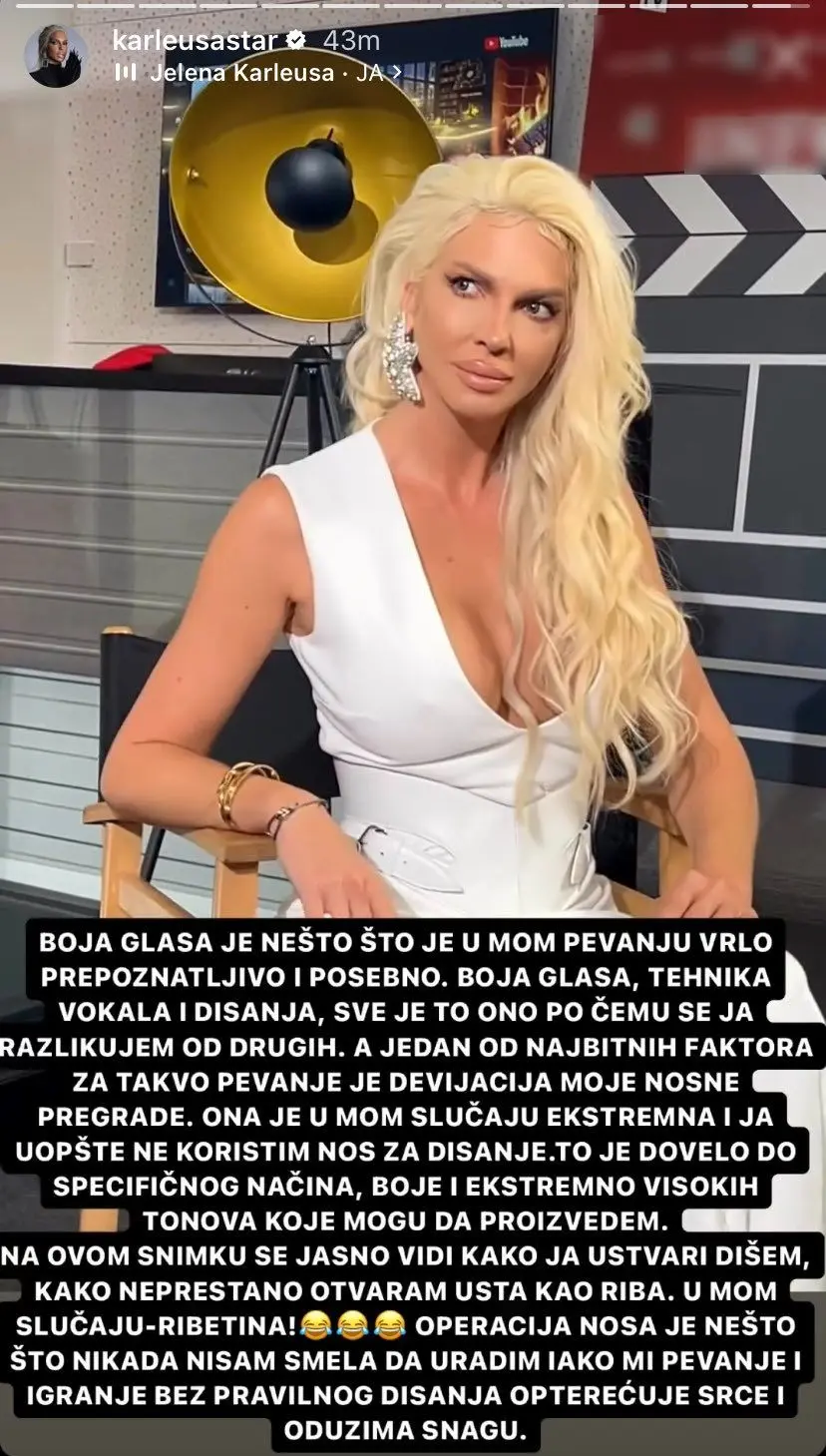 "To je dovelo do specifičnog načina, boje i ekstremno visokih tonova koje mogu da proizvedem. Na ovom snimku se jasno vidi kako ja u stvari dišem. Kako neprestano otvaram usta kao riba. U mom slučaju - ribetina! Operacija nosa je nešto što nikada nisam smela da uradim, iako mi pevanje i igranje bez pravilnog disanja opterećuje srce i oduzima snagu", otkrila je Jelena Karleuša putem svog Instagram naloga.